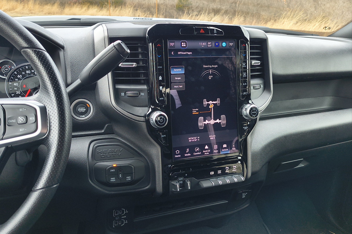 Ram 2500 trucks are equipped with one of three infotainment screens. Tradesman, Black Express, Warlock and Big Horn models come standard with an 8.4-inch touchscreen display, while Power Wagon, Rebel and Laramie trucks get a larger 12-inch unit (the mid-size 12-incher can be optioned in lower trim levels with various packages), and top-shelf trucks have a mammoth 14.4-inch touchscreen that dominates the center of the dashboard.