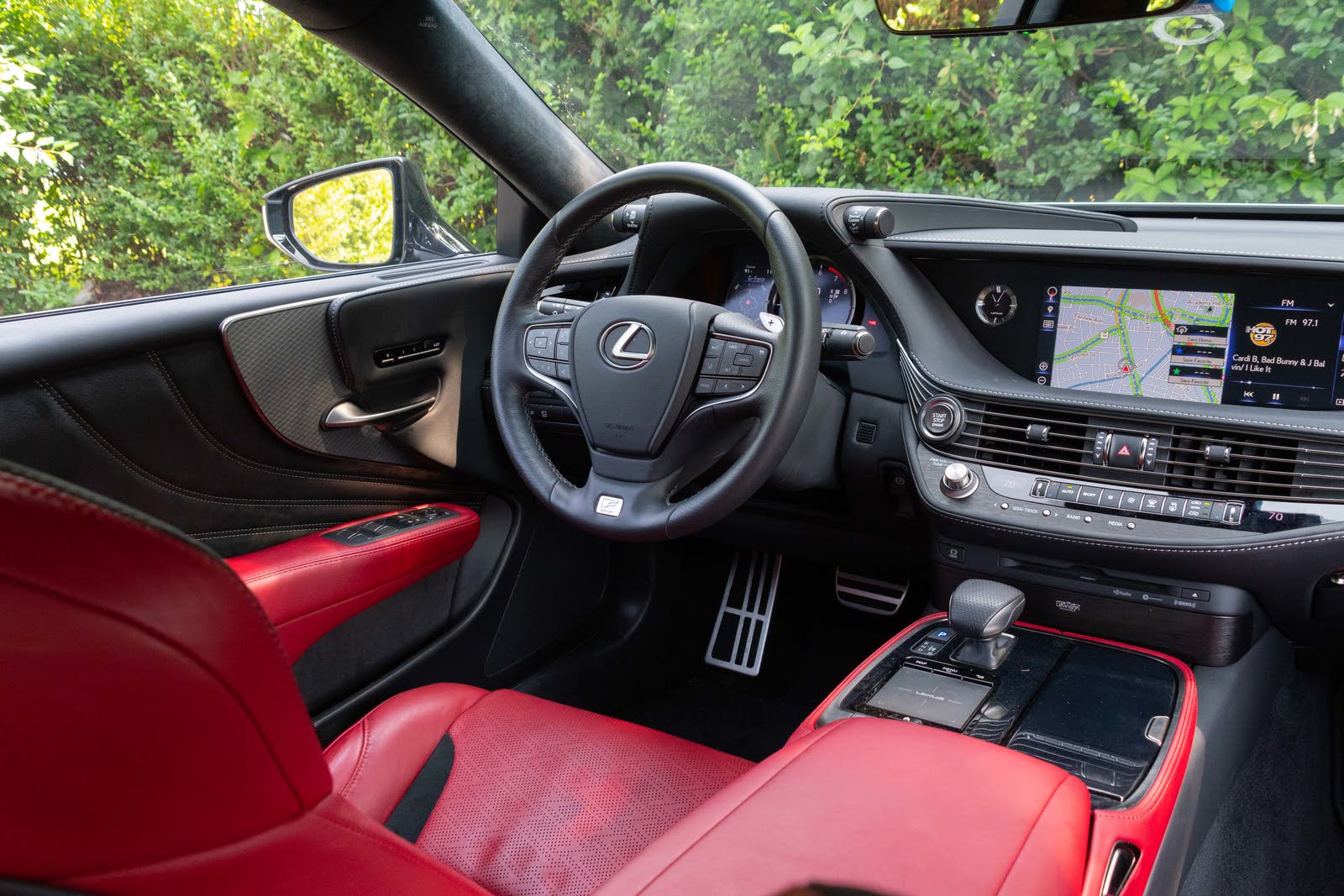 You won’t make such a foolish error inside. Our car’s red and black leather interior, combined with microsuede and bright aluminum trim, was decadent at every touch. That’s a given, of course. But the detailing—the layers of trim stacked on top of each other, vertical stitching along the doors, curved thin lines of aluminum, a backlit display of more curved lines above the glovebox, armrests that appear to float—will make your eyes water. In a good way. This trim isn’t the most luxurious, since it’s meant to be a driver’s car. Select a regular LS 500, and you can spec it with laser-cut glass trim, origami fabric hand-woven into the doors, herringbone wood, and other exotic woods and leathers in stunning patterns and colors. There’s no other luxury sedan this wild inside.