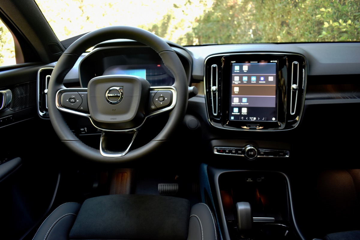 The C40 Recharge also includes a one-pedal drive mode that genuinely allows you to drive it without touching the brake pedal in most situations. That’s important in an EV, as it lets the driver take full advantage of regenerative braking and get some energy back when decelerating. Drivers who may not be used to one-pedal driving can also turn this function off. That switches to less-aggressive regenerative braking, letting the car coast a bit before decelerating, and it activates a creep mode that lets the car roll forward when the brake pedal is released, similar to a gasoline car.