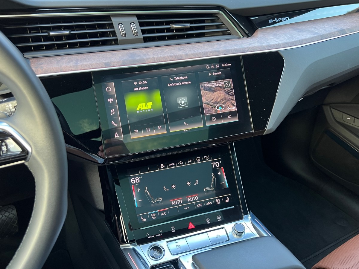 There is an MMI data panel that shows you how to increase your range by turning off power-robbing functions and features. For example, it told us we could increase the e-tron’s range by 14 miles by turning off the air conditioning and ventilated driver’s seat. But with the triple-digit temps, that wasn’t in the cards.