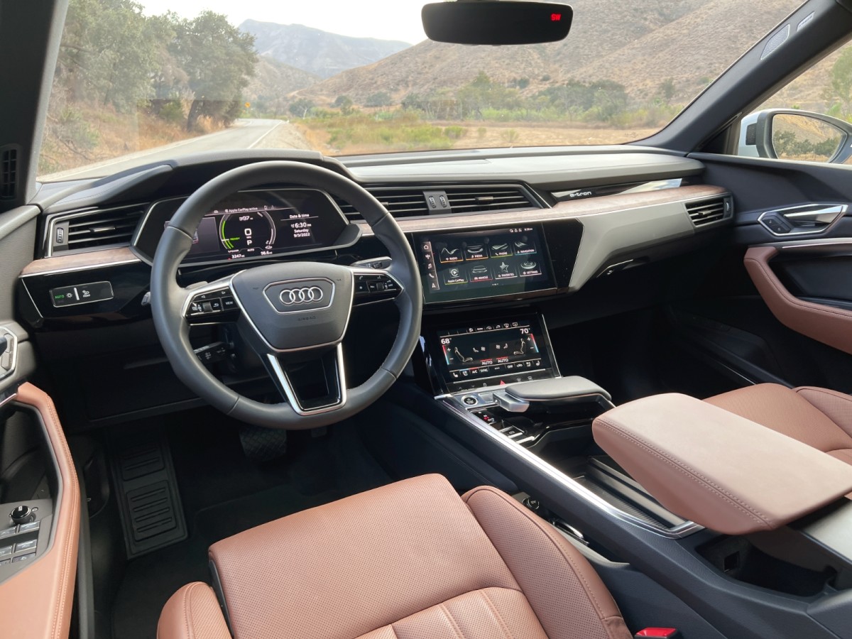 With Prestige trim, the Sportback’s gorgeous Turbine-design 22-inch wheels do all of the talking, along with orange brake calipers that match the e-tron emblem on the charging port door. And while our Glacier White test vehicle looked terrific, we’re suckers for the Plasma Blue color that is also available for the e-tron Sportback. Yummy.