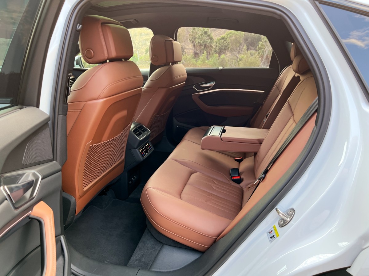 Coupe-style SUVs typically offer less rear-seat room than their conventional counterparts. That’s true of the e-tron Sportback, though the differences are negligible. Our test vehicle had heated outboard cushions, two sets of air conditioning vents, rear side window shades, and a separate climate control panel to allow passengers to customize their environment.