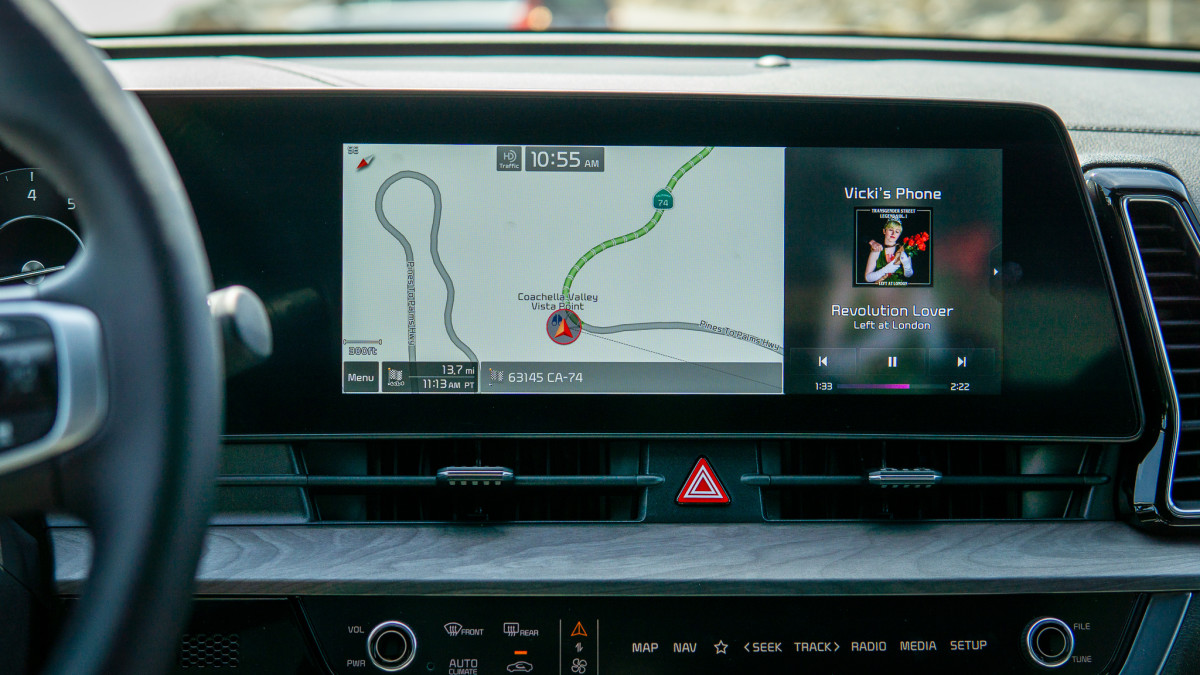 If there’s one area where the 2023 Sportage falls short, it’s how it uses technology to overcomplicate basic functions. The HVAC controls, for instance, are pretty frustrating. They’re controlled with touch-sensitive buttons rather than physical ones. These can be tough to locate when driving and, making matters worse, Kia added a dual-functionality to those buttons; hit the fan icon and you’ll see what you need to turn the heat up or down, click on the AC, and generally keep yourself comfortable. Hit the navigation triangle just above the fan icon, however, and those climate-control buttons disappear and are replaced with controls for the map, navigation, and radio. It’s cool in theory but frustrating in practice.
