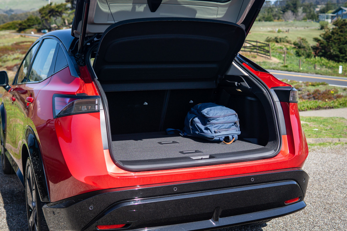 Given the airy interior, there’s not quite as much trunk space in cars like the Ariya as we’d instinctively expect. Total cargo space measures 59 cubic feet, putting it on par with the Hyundai Ioniq 5 and Ford Mustang Mach-e, but well behind the max capacity of a Nissan Rogue, Hyundai Tucson, or Ford Escape.