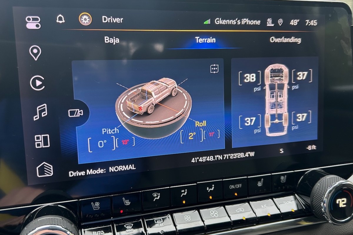 The standard infotainment system across the Colorado lineup is an 11.3-inch touchscreen. It has an intuitive layout, and despite its large size, there are still some hard-button controls. It has a logical layout and a digital dock of buttons along the left side of the screen for the radio, navigation, and other vehicle settings. The Colorado’s infotainment system comes standard with wireless Apple CarPlay and wireless Android Auto. That digital dock remains in place on the left side of the screen even with CarPlay in use, which means you can jump out of CarPlay and into another menu quickly. The presence of a digital home button and an actual volume dial are critical for operation without a learning curve. You might get lost down some rabbit hole of menus, but you can always hit the home button.