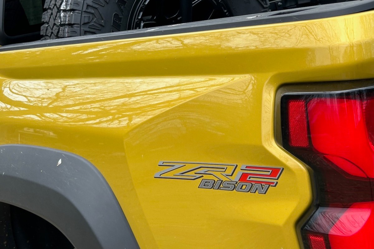 We drove the Chevy Colorado ZR2 Bison, which is essentially an upgraded version of the ZR2 with additional off-road protection. It features unique bodywork and extensive use of protective gear. The Bison includes AEV (American Expedition Vehicles) stamped steel front and rear bumpers, underbody skid plates (made of Boron steel), and exclusive AEV-designed wheels. It also features 35-inch mud-terrain tires, and the front bumper is capable of handling the installation of a heavy-duty winch. Our press model also featured the ZR2 Convenience Package, which included memory settings for the driver's seat and side mirrors.