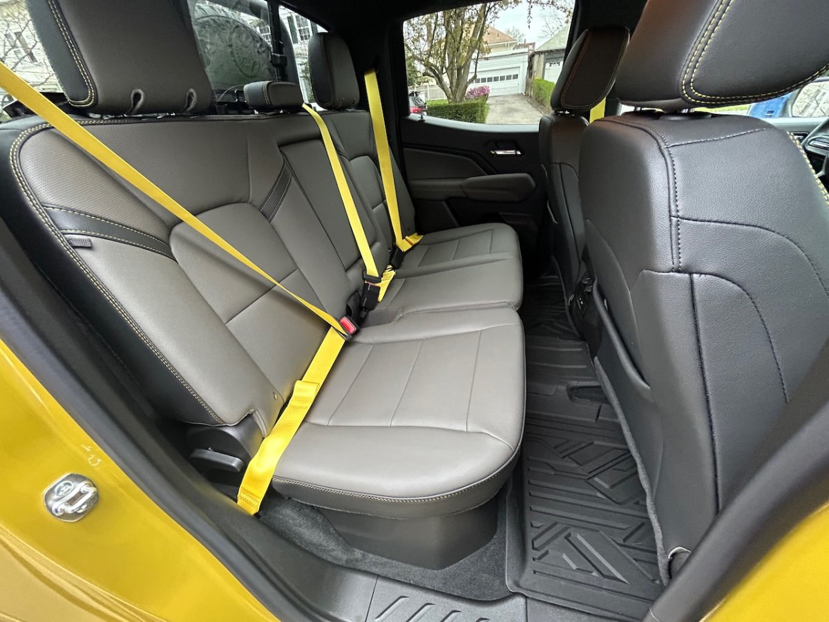 Second-row legroom is typically tight among smaller trucks and it’s no different with the Colorado. Anyone over six feet tall will find some tight legroom in the second row, especially if the front-row passengers are also tall and cannot slide their seats forward. But you could theoretically fit five adults in the Colorado for trips across town or around the corner.
