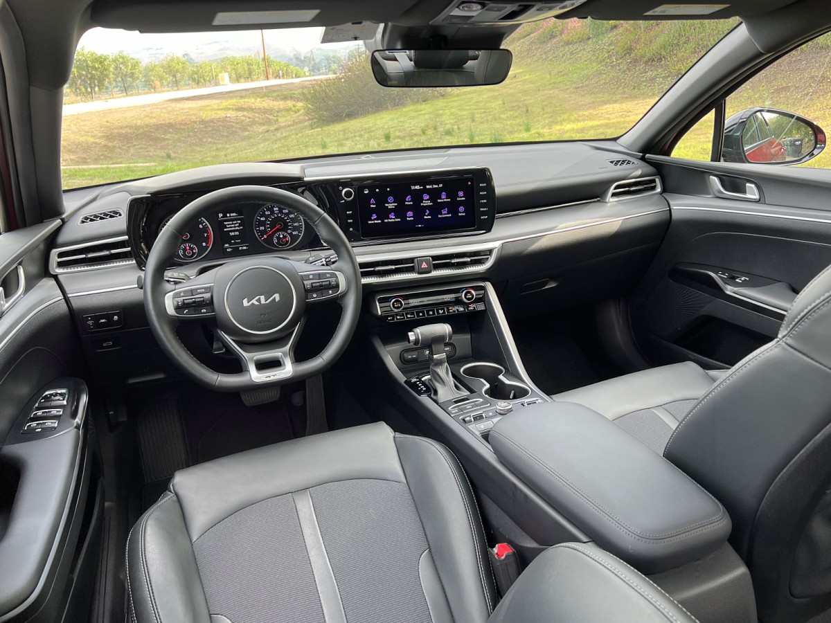 Dual-zone automatic climate control is standard, and all but the base K5 LXS have heated front seats. You can get a leather-wrapped heated steering wheel and ventilated front seats with K5 EX and GT trim. The heated wheel is standard on the GT-Line with AWD.