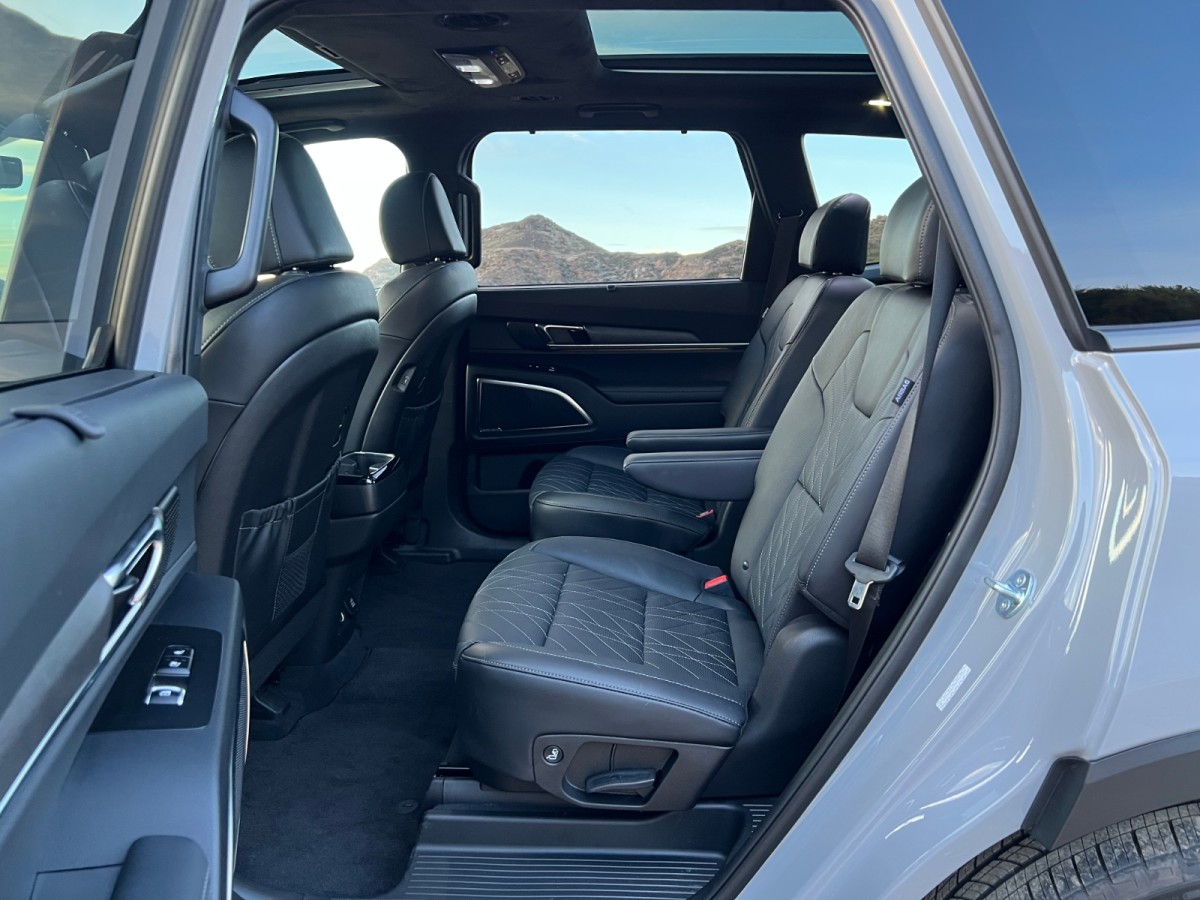 A camera-based rearview mirror offers a clear view of what’s behind the SUV. The image resolution is remarkably good, so if you find yourself behind a new Telluride in traffic, don’t pick your nose, or you might wind up going viral on TikTok.