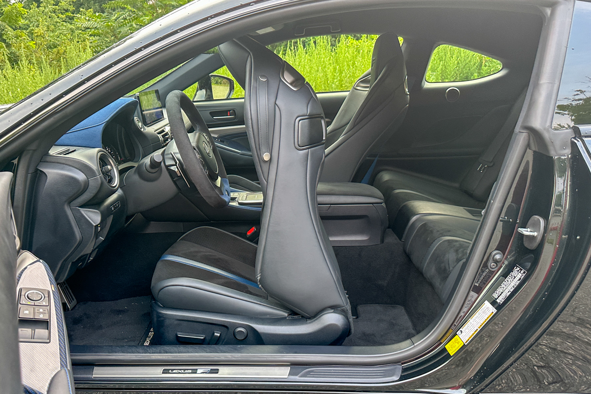 Like its exterior, the RC F’s interior could be called “dated” or “nostalgic,” depending on your perspective. We tend to feel that the glass is half full when we’re piloting a sleek and powerful sports car, and we appreciated the serviceable cabin for its straightforward simplicity. There’s none of the bloat or gadgetry you find in most cars flying off the lots in 2024, and even the many blue “F” accents are dark enough to avoid outright flashiness. We found the front bucket seats to be nicely proportioned, with bolstering in all the right places. Of course, everyone’s built differently, and you’ll want to carefully assess your own comfort level in these seats if the RC F is on your shopping list. All that can be said about the back seats is that they are very tight, but we suspect they exist only as a concession to insurance rates anyway.