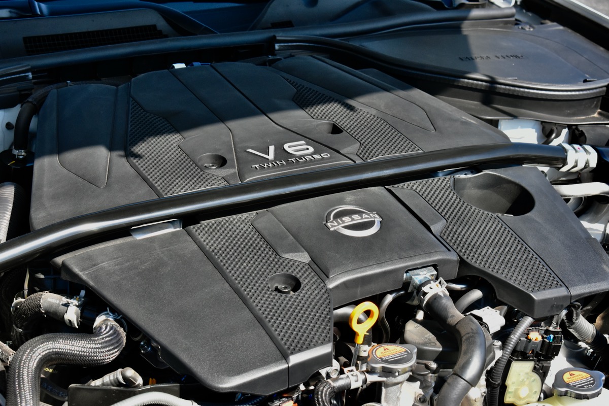 All 2024 Nissan Z models use a 3.0-liter twin-turbocharged V6 similar to the engine used in the Infiniti Q50 sedan from Nissan’s luxury division, with standard rear-wheel drive (RWD) and a limited-slip differential. The V6 makes 400 horsepower and 350 pound-feet of torque—more horsepower, but less torque, than a six-cylinder Toyota Supra—in the Sport and Performance models, both of which are available with six-speed manual or nine-speed automatic transmissions. The latter includes paddle shifters and launch control.