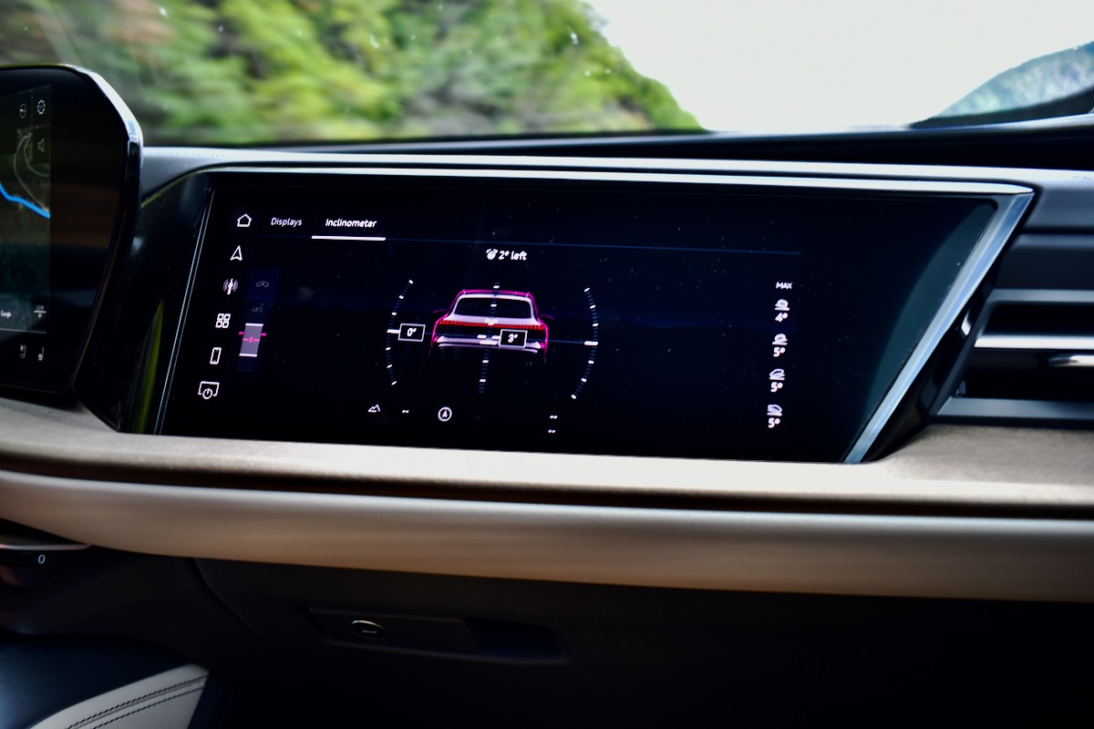 The screen setup carries over from the electric Audi A6 e-tron and Audi Q6 e-tron, with the same version of Audi’s MMI (Multimedia Interface) infotainment system, which is based on the Android Automotive OS. It’s in keeping with the automaker’s strategy of offering common tech features across its EV and internal-combustion vehicle lineups. Luckily for loyal Audi customers, the curved display is easy to both see and reach from the driver’s seat. Achieving that perfect positioning meant tilting the main touchscreen away from the front passenger, but that’s where the optional third screen earns its keep. Front-seat passengers can play DJ, pull out inclinometer or altimeter readouts, or watch videos (a filter ensures they can’t be seen from the driver’s seat).