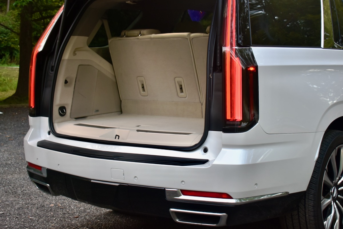As noted above, the three-row Escalade is available in short-wheelbase and long-wheelbase configurations. The long-wheelbase Cadillac Escalade ESV is 13.2 inches longer between the wheels than the standard Escalade, contributing to a 15.1-inch increase in overall length. That primarily benefits cargo space and third-row legroom, which grows by 1.7 inches in the ESV. Headroom and legroom in the first two rows are the same regardless of body style. Seating for up to eight is available in either case, or seven if you opt for second-row captain’s chairs.