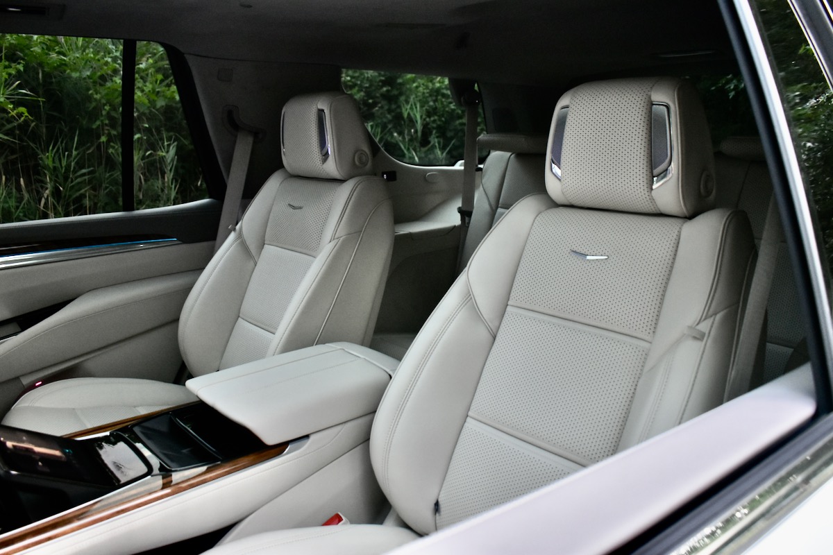 Just like the luxury sedans it has effectively replaced in Cadillac’s lineup, the Escalade also offers extensive creature comforts for second-row passengers. The optional ($7,500) Executive Second Row Package includes a pair of 12.6-inch screens and a center console with dual wireless device chargers, its own set of controls for functions like temperature, and storage cubbies. The seats also get upgraded with massage and headrest speakers, bringing the total number of possible sound-system speakers to 40.