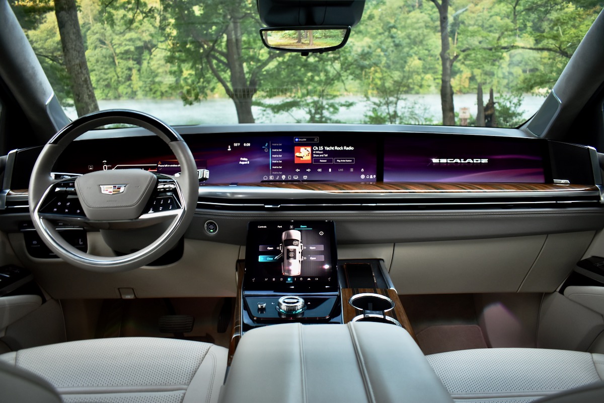 All of this tech can seem overwhelming at first, but Cadillac made some sensible choices to aid usability. Unlike most of the brand’s electric models, the Escalade retains standalone wireless Apple CarPlay and Android Auto, as well as a hard button to turn the vehicle on and off (headlights are still controlled via the touchscreen, however). The rows of icons for things like music and phone connectivity on the main screen and seat adjustment and camera views on the supplementary screen below, are also easy to decipher. Cadillac’s voice recognition isn’t as sophisticated as the BMW or Mercedes systems, however.