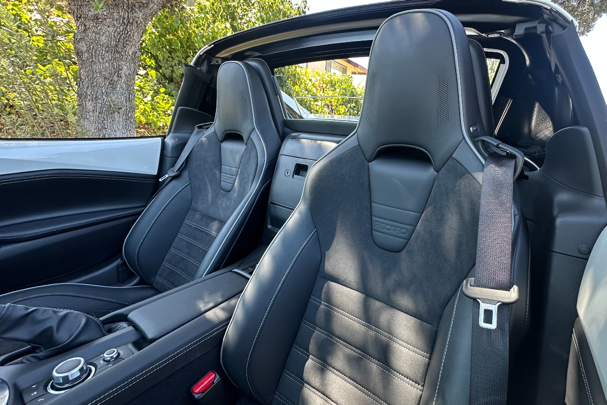 Seat adjustability is limited, but taller drivers have a few more options here than they did in past generations of the Miata. Although there isn't much room to move fore and aft, the steering wheel tilts and telescopes. That might sound like a basic function but Mazda didn't even include this feature until a few years ago.