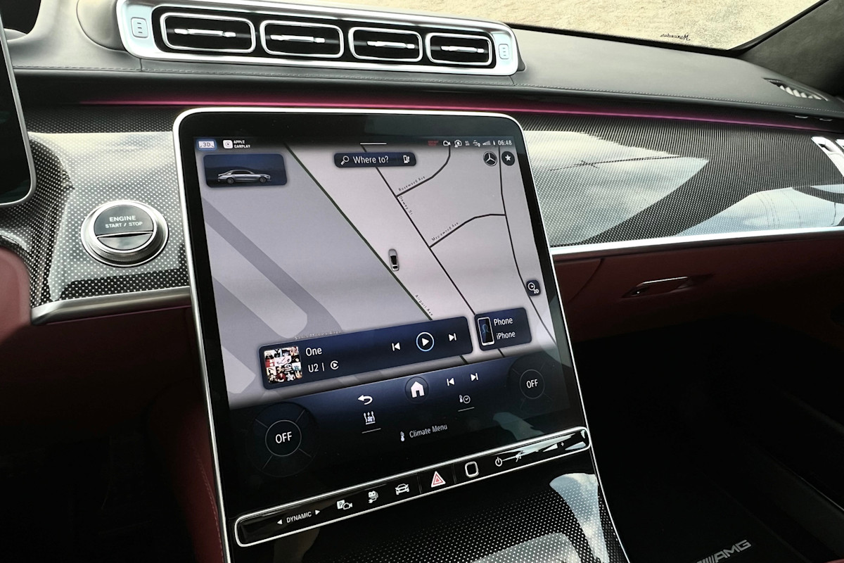 Connected in-car apps: Apple Music · Infotainment: MBUX · Infotainment screen size: 12.8 in. · Smartphone integration: wireless Apple CarPlay