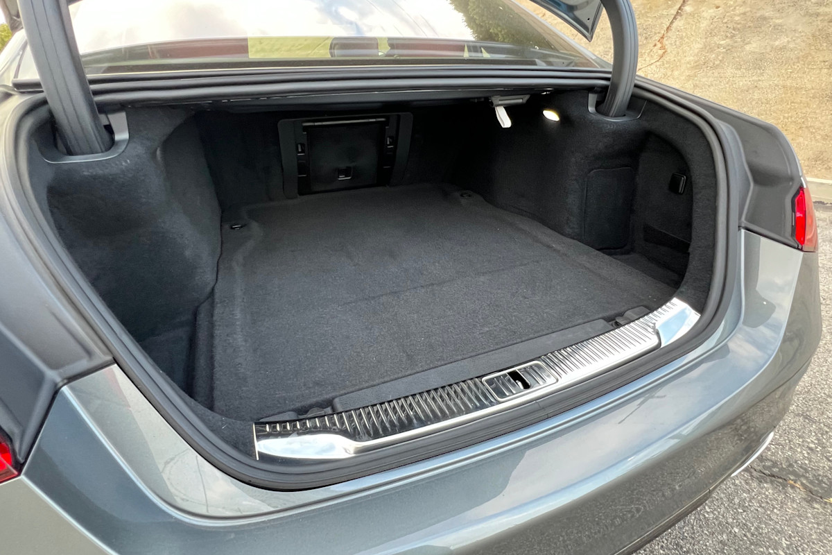 Behind those seats, the specs reveal a rather disappointing cargo capacity of only 8.1 cubic feet for the S 580e. In reality, the trunk seems much larger and should easily accept several large golf bags or check-in rolling luggage. Other S-Class models increase the capacity to 12.8 cubic feet, which falls just shy of the 15 cubic-foot average for the class. A center pass-through door allows for longer items, and a handy flip-down hook will keep your shopping bags from releasing their contents.