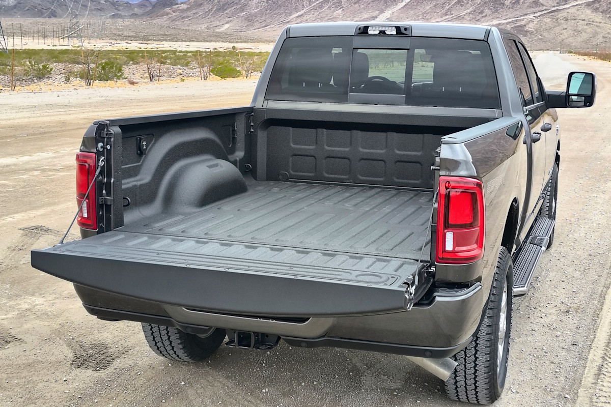 Ram’s use of a five-link rear suspension design and coil springs in its heavy duty 2500 pickup pays dividends on the road, providing a more composed ride over rough surfaces when compared to the leaf springs of other trucks. Optional air suspension packages allow the driver to compensate for heavy loads, and they can even lower the truck’s rear ride height to make it easier to load the bed or hook up a hitch. Considering its size and capabilities, the Ram 2500 rides exceptionally well—loaded and unloaded. We also drove it with 1,000 pounds of dog food in the bed (donated to local canine shelters after).
