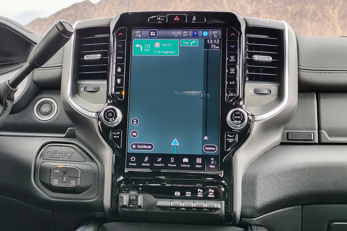 If you like screens and believe bigger is better, you’re going to appreciate the Ram 2500. An 8.4-inch touchscreen infotainment system running Ram’s latest Uconnect software comes standard on the two lowest trims, but a desirable 12-inch replacement can be added as part of an option package. The 12-incher comes standard in the Power Wagon, Rebel and Laramie, while an optional 14.4-inch unit is so large it extends up past the top of the dashboard. The biggest screen comes standard on the two upper-crust trims. If that’s not enough screen real estate for you, Ram offers a separate screen for the front passenger that’s not visible from the driver’s seat.