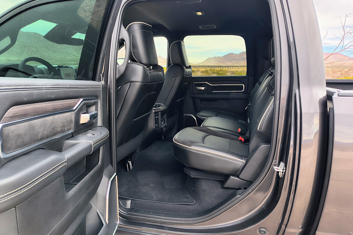 In addition to all the trim levels we’ve considered, and proving that there’s a configuration for every potential customer, buyers can choose between Regular Cab (Tradesman and Big Horn only, paired with an eight-foot bed), Crew Cab (with a six-foot-four bed or eight-foot bed) or Mega Cab (Laramie, Limited and Limited Longhorn only, paired with the shorter bed). The Crew Cab offers a reasonable amount of space in the back seat for adult passengers. A six-foot passenger can sit behind a six-foot driver without touching the seatback, and there’s more than enough head room. Three adults in the back seat is doable with some elbow touching. If you want maximum spaciousness, the elongated Mega Cab offers limo-like levels of legroom.