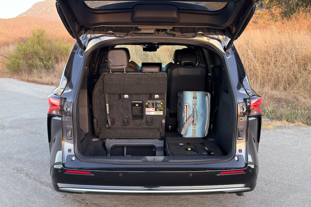 The Platinum’s second-row, long-slide, reclining captain’s chairs with ottoman-style leg rests were a hit with teenagers. They thought the refrigerated compartment on the back of the center console was cool, too. As you’d hope of a minivan, the third-row seat is accommodating of adults. Also, thanks to the sliding side doors and second-row seats, loading and unloading people is easy, even in cramped parking situations. All but LE models have a hands-free power liftgate, too.