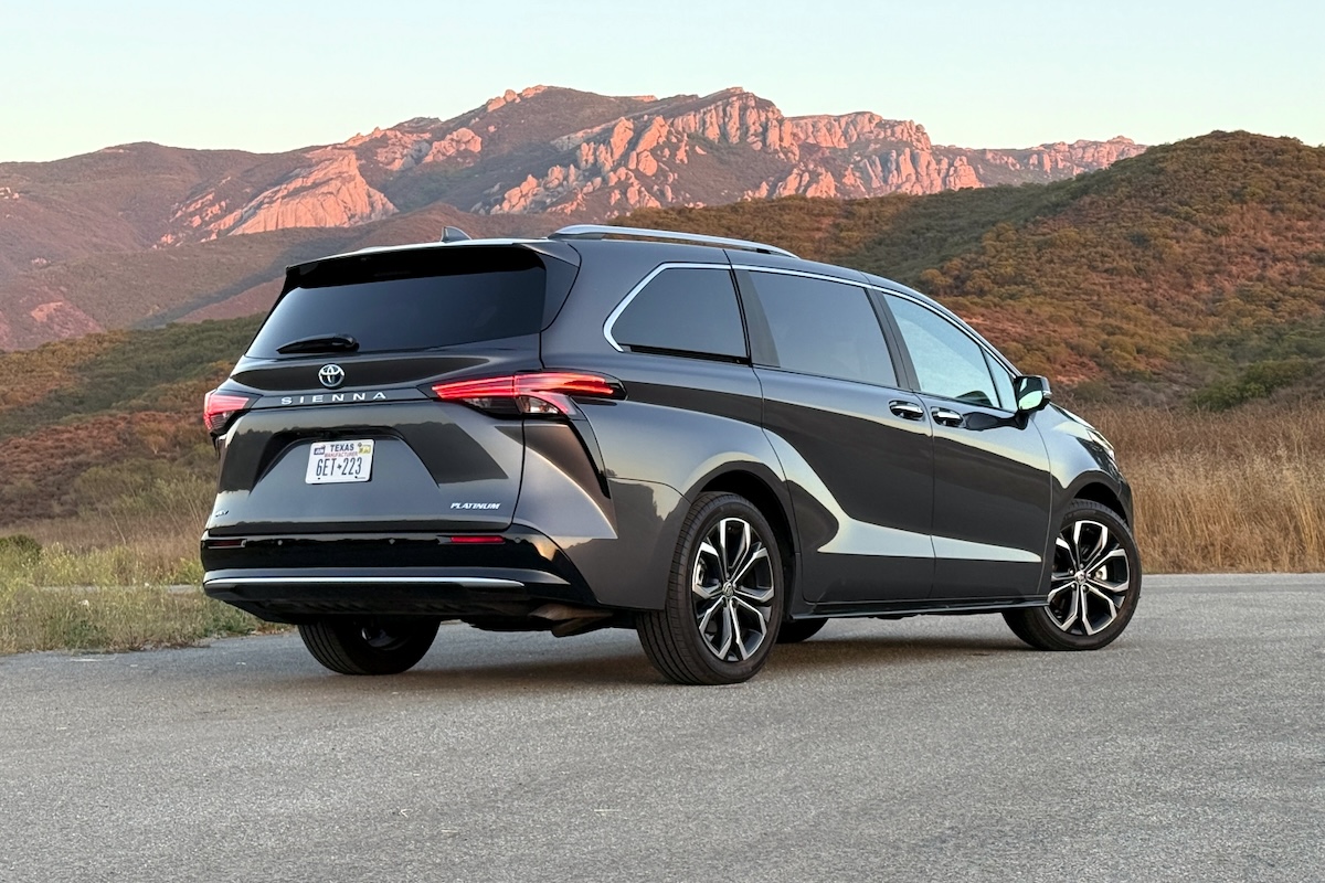 Decades ago, some minivans were referred to as Dustbusters because they resembled the popular cordless hand vacuum. Arguably, today’s Dustbusters have more style than a typical minivan—after all, there’s only so much you can do with a box-on-wheels design formula that exists to maximize interior passenger and cargo room. Toyota has tried, although the 2025 Toyota Sienna’s trapezoidal grille, which appears as though it’s ready to Hoover up the road, doesn’t help to dispel the hand-vac metaphor. There are also upswept body lines, hidden sliding door tracks and swollen rear fenders that wrap into a rear end that mimics the cinched-in-the-middle look in the front. Narrow taillights feature sharp corner spears that stab down to define the edges of the Sienna, drawing a family resemblance to the Camry sedan. This year’s Platinum trim level gets new flower-petal wheel designs to replace the previous split-five-spoke design.