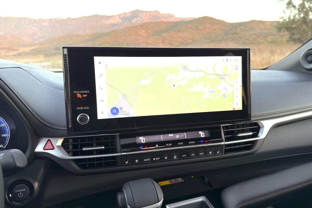 While entry-level models have smaller displays, Toyota equips the higher-spec Sienna models with a 12.3-inch digital instrumentation panel and a 12.3-inch touchscreen display for the Toyota Audio Multimedia (TAM) infotainment system. In addition, our Platinum test vehicle featured a four-zone automatic climate control system with ice-cold air conditioning, a 10-inch head-up display (HUD), and a camera-based digital rearview mirror. An Entertainment Package is available, installing an 11.6-inch display, an HDMI input, a remote, and two wireless headphones.