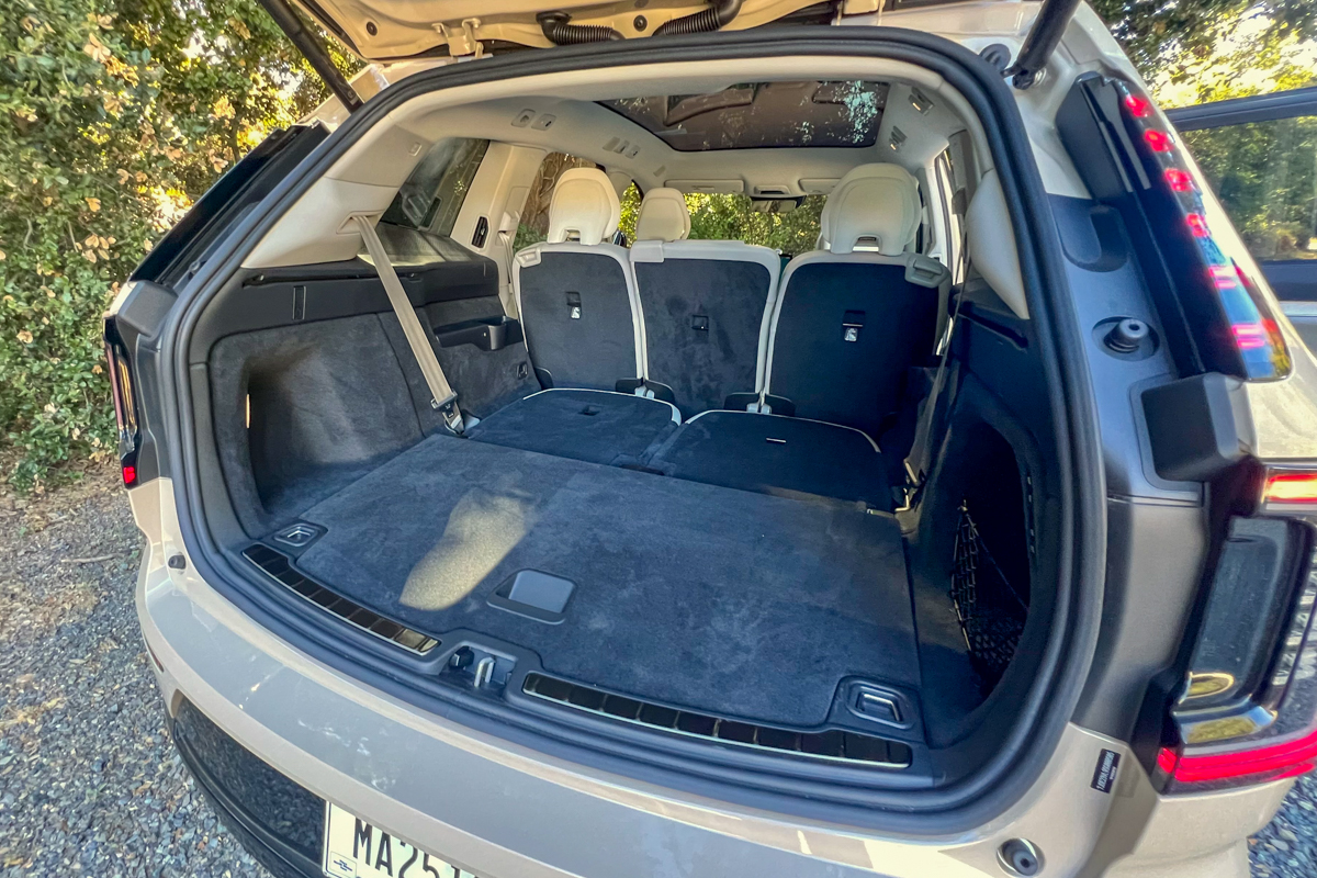 Behind the third row, the cargo capacity is listed at only 13.5 cubic feet, but that figure is only when loaded to the top of the seat backs. The space itself is large and very usable and there's also a deep bin underneath the floor. Folding the seats for more space is easy, thanks to one-touch buttons in the cargo area, and loading bulkier items is helped by the air suspension that lowers itself. There is a small front trunk (frunk) that adds another 1.7 cubic feet, but it's best left for charge cables or other seldom-used items.