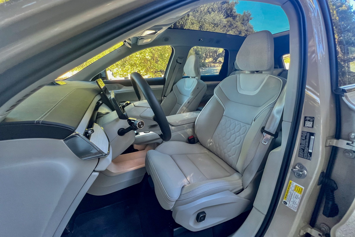 Our test vehicle came with the Nordico synthetic leather seat upholstery that looks and feels appropriate in a luxury setting, but in the hot August sun, we found it tended to be rather stifling. The Tailored Wool Blend would be a better choice for a material that breathes better, though it's unclear if it will be as durable or stain-free as the Nordico. Overall, the EX90 presents a very favorable first impression that places it well among premium luxury SUVs.