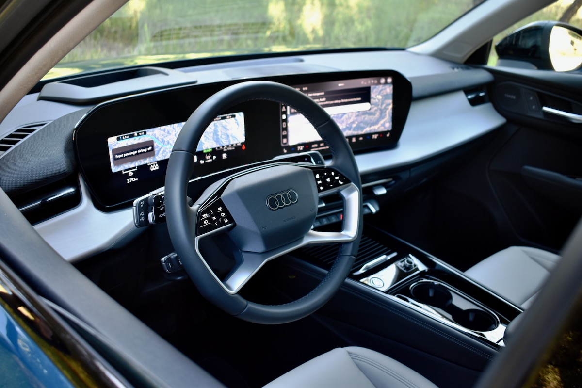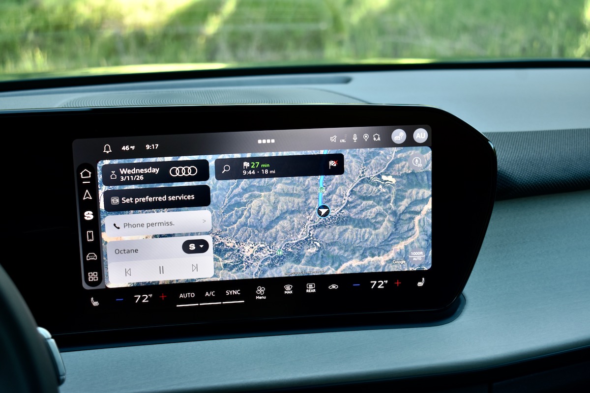 The 2026 Q3 also debuts a new control layout. The shifter and turn signal/wiper stalks are replaced with a bar that runs across the steering column. Drivers shift and signal by tapping and flicking small tabs, and there’s a small click wheel for some of the wiper settings (a conventional stalk still handles cruise control). This sounds more confusing than it is, and makes for a cleaner look, according to Audi. Our only complaint is that it’s easy to accidentally brush the steering wheel touchpads, making it difficult to shift from Park to Drive without also switching radio stations.