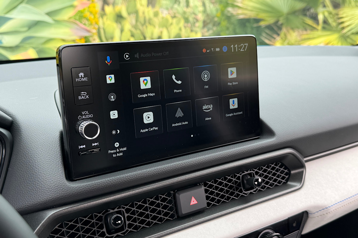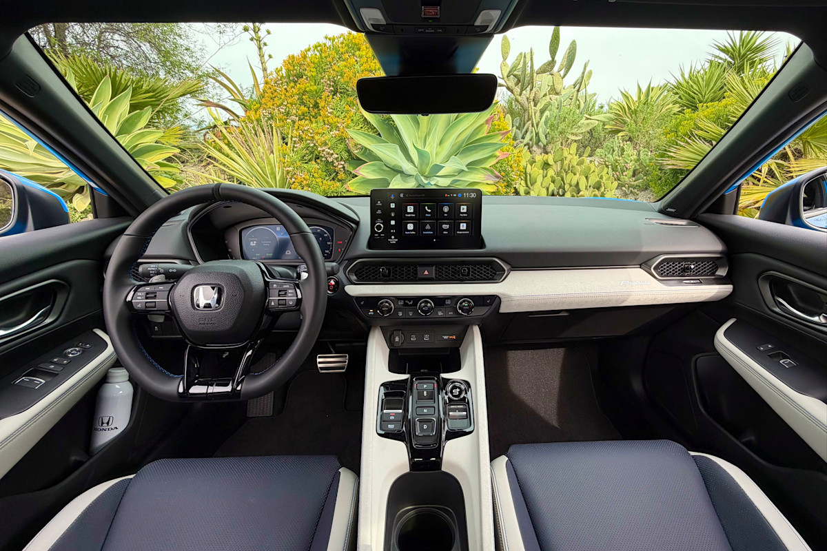 Ties to Honda's contemporary design are much more prevalent inside, with a similar-looking steering wheel, mesh grille vents, and climate controls to the entry-level Civic, and the same push-button gear selector found in larger Honda SUVs. The synthetic suede trim lends the cabin a more upmarket and racy feel that we'd expect from a Civic Type R or an Acura Integra, while the inviting two-tone white interior shown here furthers the sense of occasion, though it's only available on the Boost Blue and Winter Frost white paint colors.