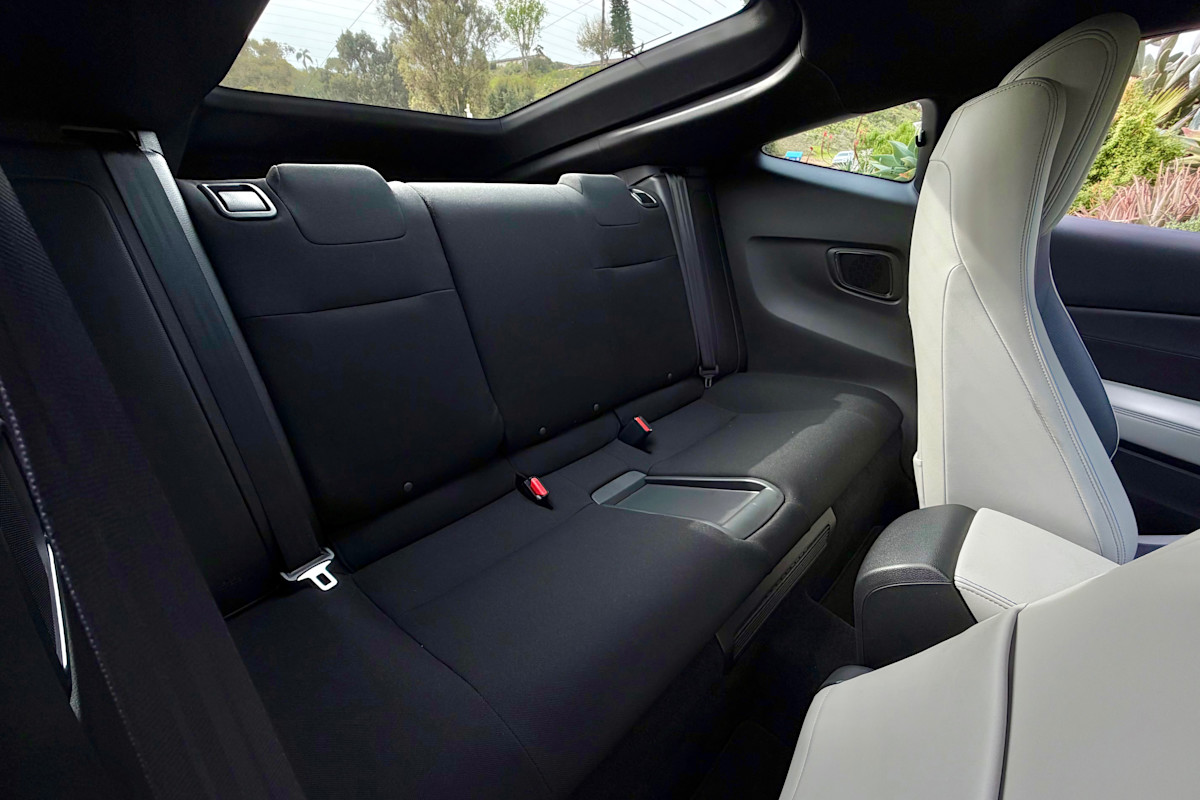 The rear seats, however, are decidedly downmarket, with a rather coarse black fabric upholstery surrounded by hard plastics. Considering the lack of space back there, we're more inclined to think that most owners would choose to keep the seatbacks folded to allow for more cargo capacity, using them for passengers only when needed.