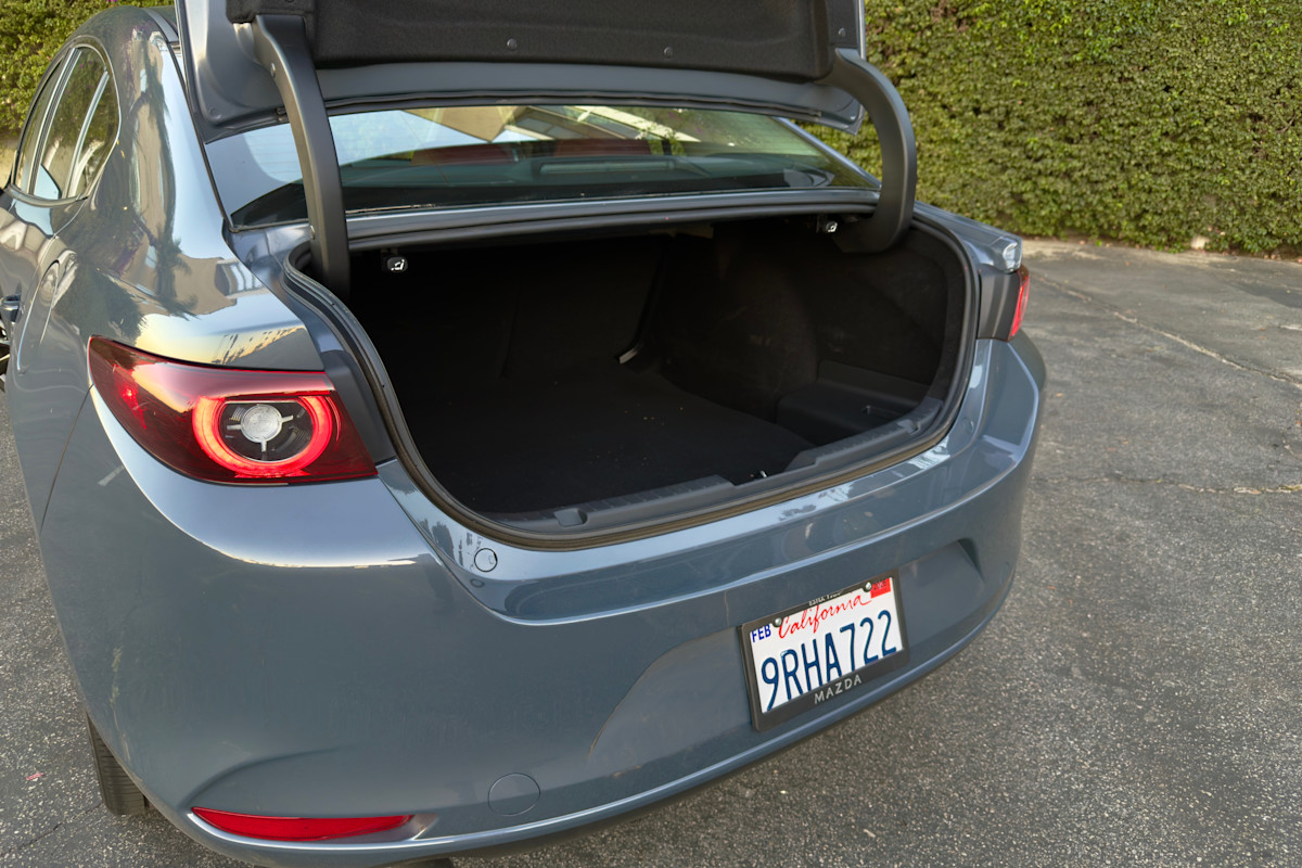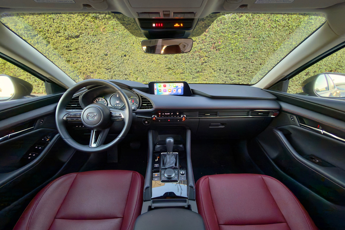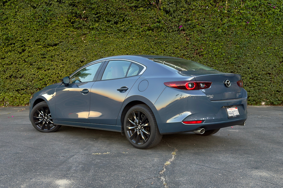 The 2026 Mazda 3 is offered with the choice of two drivetrains. Our 2.5 S Carbon Edition trim comes with the base 2.5-liter four-cylinder that produces 191 horsepower and 186 pound-feet of torque, shared with the 2.5 S, 2.5 S Select Sport, and 2.5 S Preferred trim levels. A six-speed automatic transmission is obligatory with the sedan, but the Mazda 3 hatchback is also available with a six-speed manual. Most models are front-wheel-drive (FWD), but all-wheel-drive (AWD) is standard on the Carbon Edition and 2.5 Turbo Premium Plus. The Turbo model increases output to 227 hp and 310 lb-ft of torque on regular unleaded fuel with forced induction. With premium, that climbs to 250 hp and 320 lb-ft of torque.