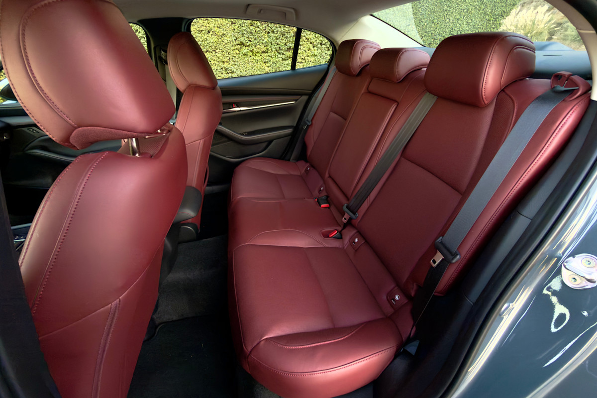 It's not all for show, either, as the Mazda 3's materials quality is noticeably nicer than anything else in the class. Soft-touch surfaces abound, and the genuine stitching in the dash and door panels lends it a more upscale personality. Our only nitpick is the top-most door panel section that resembles vinyl more than simulated leather, but even that is an improvement over its rivals. Helping matters is a solid underlying construction that is devoid of any creaks or squeaks. In our higher-trimmed Carbon Edition model, red leather upholstery adds a racier look that further sets the Mazda apart from the competition.