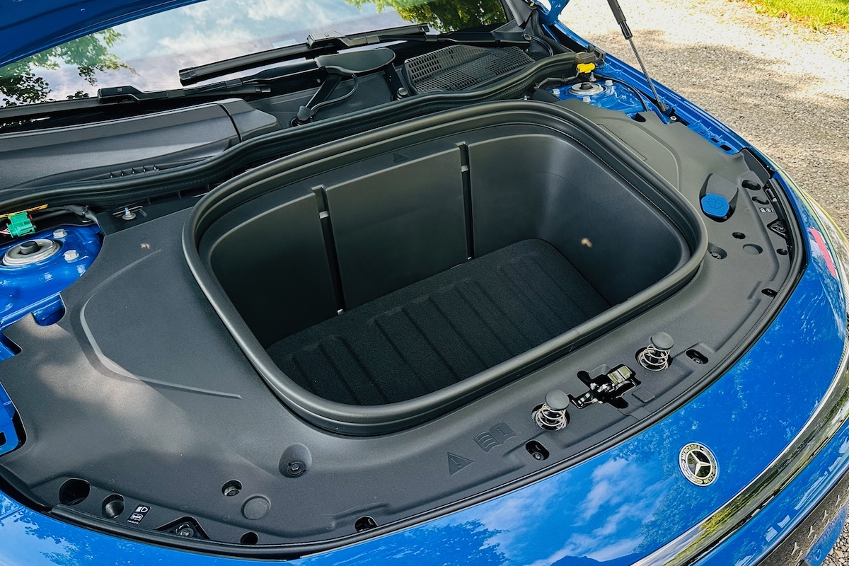 The CLA has a roomy 2.5-cubic-foot frunk—the first in a Mercedes since the 130 model way back in the 1930s. It’s large enough for a backpack or two, or a few bags of groceries. The rear trunk is not quite as large as offerings from Tesla or BMW, but it’s plenty roomy at 14.3 cubic feet.