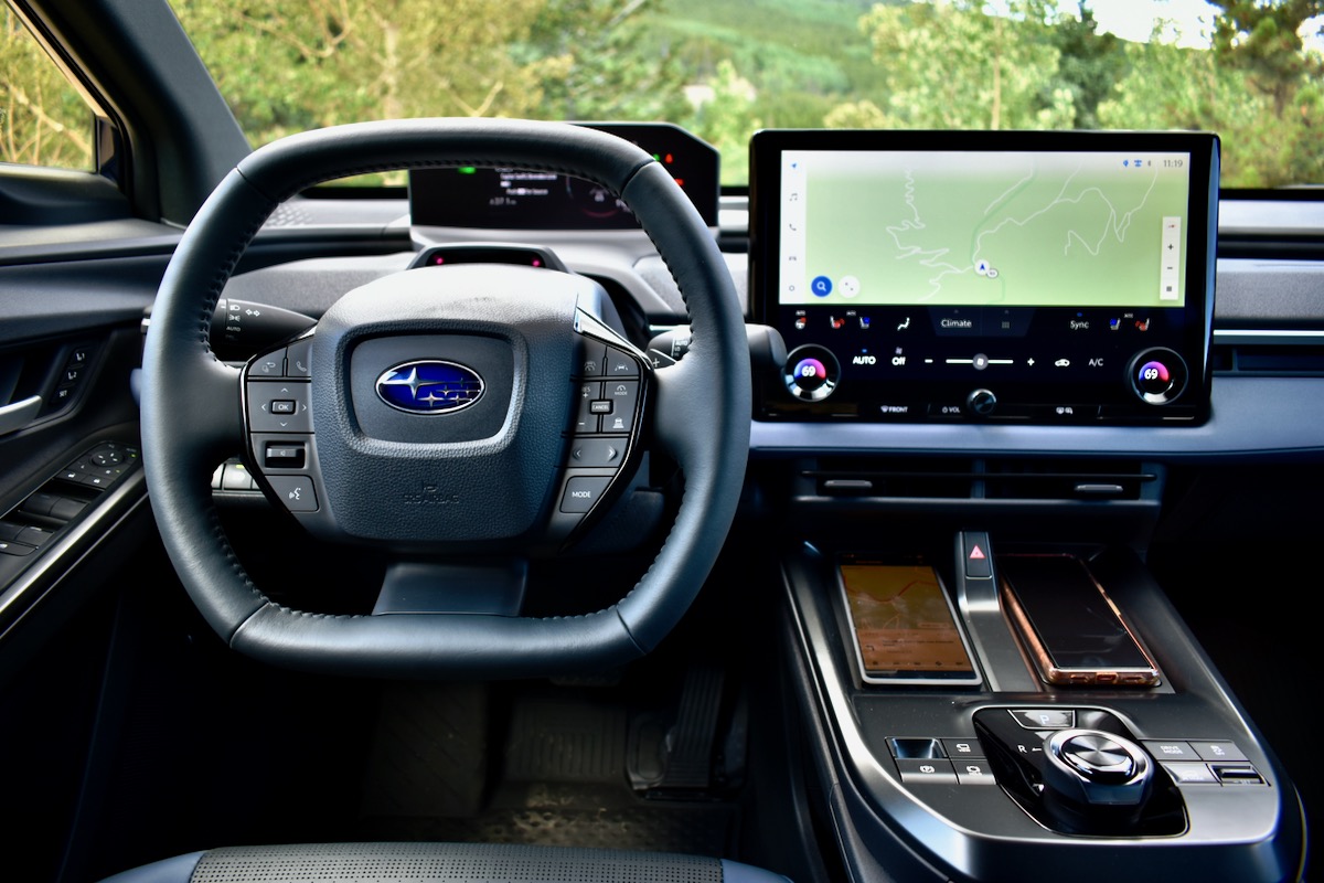 The regenerative braking system was retuned for what Subaru calls “more distinctive” settings. There are five to choose from, but even with this retuning we tended to go straight from the strongest setting for surface streets and back roads to the weakest setting, to allow for coasting on highways. Not terribly different from most other EVs, in other words. Maximum regen also required only occasional use of the brake pedal.