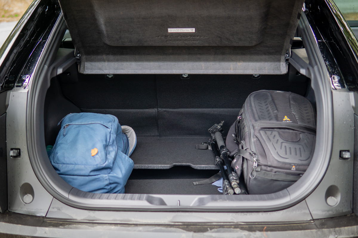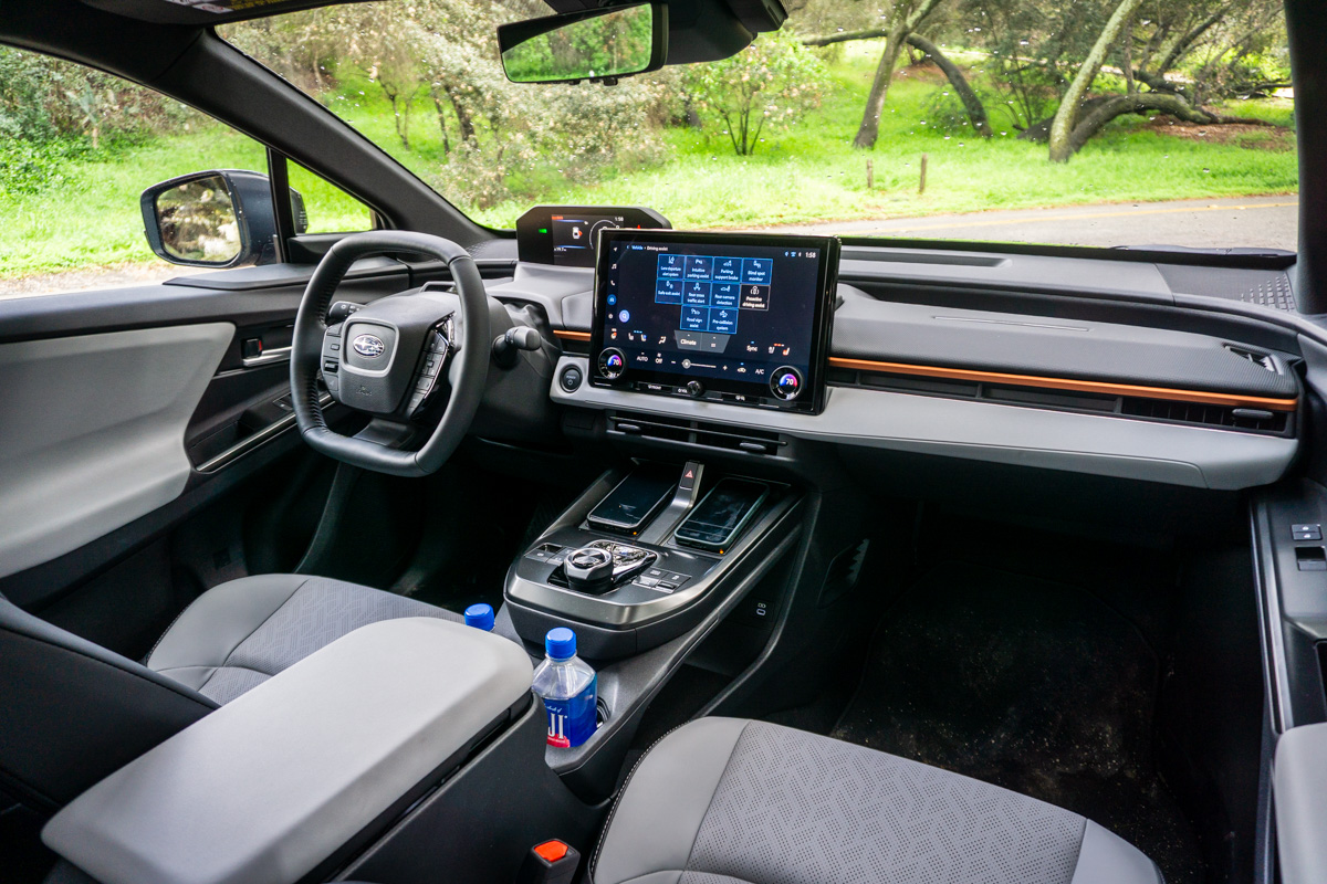 Cargo space behind the second row is 25.4 cubic feet with the lower deck board in place, or 23 cubic feet with the board in its upper position. A power rear liftgate is standard across all trim levels, and the 60/40 split-folding rear seatback expands the capacity when needed. These aren’t class-leading numbers, and like with rear-seat space, if practicality is your focus, Subaru has two other EVs that will better fit your bill.