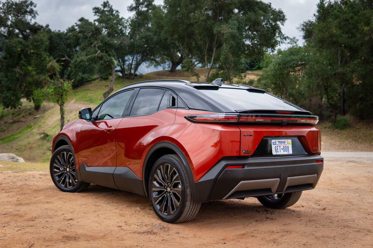 The hammerhead-style front fascia is becoming the family face across Toyota’s EV lineup, and it works well here. Things are busier around back—the C-HR wears both a split roof spoiler and a ducktail rear spoiler, which is one more spoiler than most cars need. It also boasts black roof rails, blackout badging, a lower rear diffuser, and color-keyed door handles with touch-sensor lock/unlock.