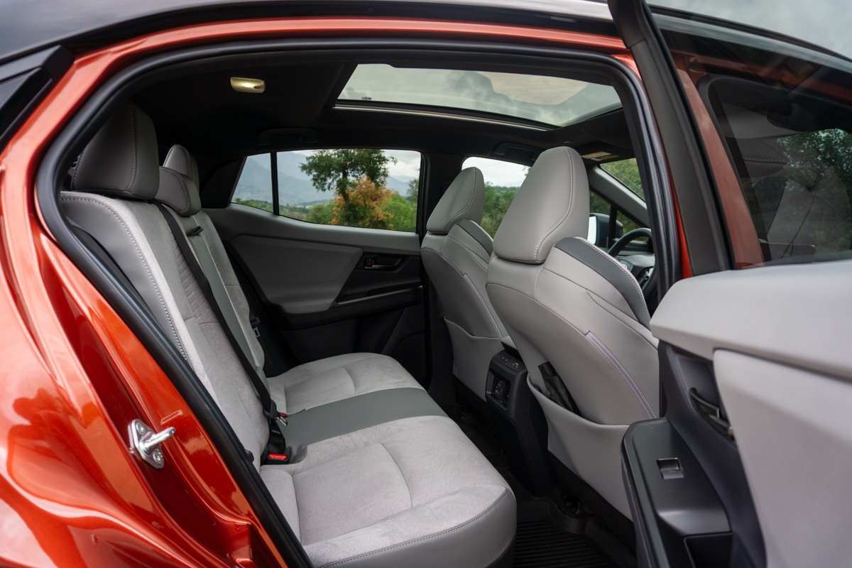 Inside, the C-HR mixes soft-touch materials with hard plastics, but fit and finish is excellent throughout. Our XSE tester’s SofTex upholstery was complemented by synthetic ultra-suede inserts that look and feel premium, although the suede is noticeably grippy. On a hot day—particularly with the optional panoramic glass roof overhead—that suede texture could be unpleasant against bare skin. A power sunshade helps, but it’s nonetheless worth considering if you live somewhere warm. A leather-trimmed steering wheel is standard on both the SE and XSE trims, and it’s a small but welcome upgrade over the SofTex-wrapped wheel Toyota uses in its other EVs.